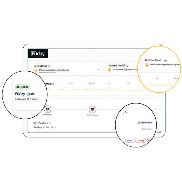 Traditional IT tools demand dedicated resources, configurations, and weeks of setup just to get basic visibility. Friday’s plug-and-go solution deploys across hundreds of sites and integrates with third-party APIs without complexity.